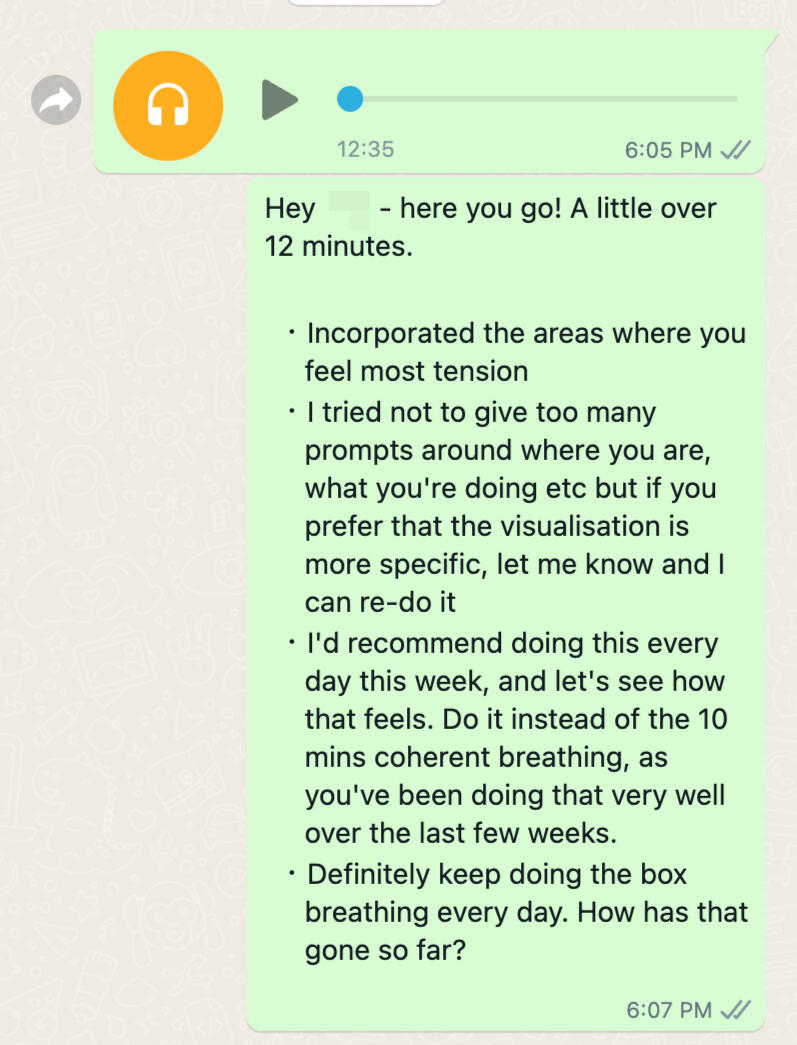None of this work is one-size-fits-all.Based on your feedback and progress, I create additional personalized visualizations and breathing exercises shared with you in-between our live sessions.P.S. the more you share with me, the more I can help!